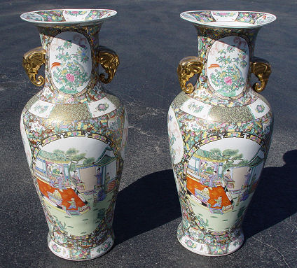 PR PALATIAL CHINESE DECORATIVE FLOOR VASES: Rose medallion coloration with gilt elephant head handles. 41''h.
