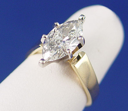2.11ct MARQUISE CUT DIAMOND SOLITAIRE: Lovely ring featuring a 2.11ct marquise cut diamond, measuring approx. 12.8 x 6.2 x 4.4, purported G color and SI2 clarity. Six prong mount of 14k yellow gold with platinum head, size 5.5, 4.8 grams. Est. $5000/7500**