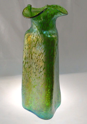 TALL LOETZ IRIDESCENT ART GLASS VASE: Three sided with blue shading along the bottom, oil spot technique, 13 1/4''h. Unsigned, free of chips, cracks or repairs. Est. $900/1200**