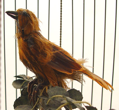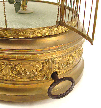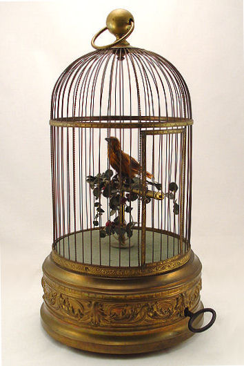 LARGE SINGING BIRD AUTOMATON: In good working order, the bird chirps a cheery son while simultaneously moving head, beak and tail. Brass cage with embossed base, the door opens. Key wind, key included. 21''h, 11'' dia.