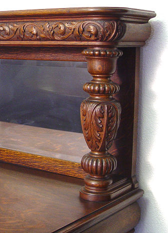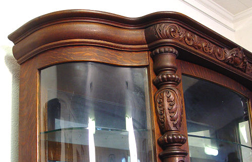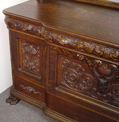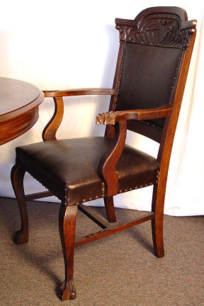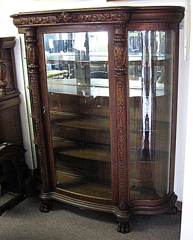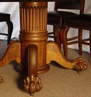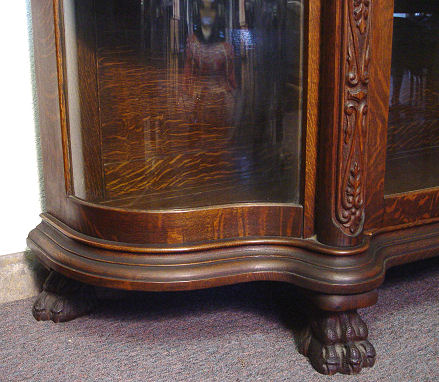 HASTINGS CARVED TIGER OAK 9 PIECE DINING ROOM SET: American 18/19th C. All the pieces have claw feet. The set includes a 54'' claw foot single pedestal round TABLE with five 9'' leaves that extend to 99''l. Set of 6 CHAIRS, one with arms. The bow front CHINA CABINET has serpentine glass sides, the single door has a curved front, overhanging top, original shelves with plate grooves, 66 1/2''h. x 60''w. x 20'' deep overall. The SIDEBOARD has a straight top with beveled mirror backsplash, 59''h. x 72''l, x 27'' deep. Excellent example of American oak furniture. The table bears a Hastings label however no signature found on either the china cabinet or sideboard although they came out of the same house and are every bit of Hastings quality. From the estate of two school teacher sisters that died in their nineties, lived together their entire lives with the furniture they inherited from their parents (the original owners).
