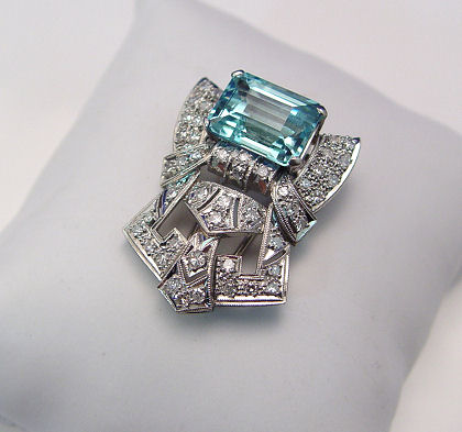 PERIOD PLATINUM 20CT AQUAMARINE BROOCH PENDANT: Delicious Deco piece, filigree platinum brooch encrusted with diamonds, approx. 2ctw Euro cut, and starring a natural aquamarine, measuring approx. 11 x 14 x 10mm. Hand made millegrain mounting, double stick pin finding, works well as a pendant or slide, approx. 1 3/8'', 15 grams. Est. $2000/2500**