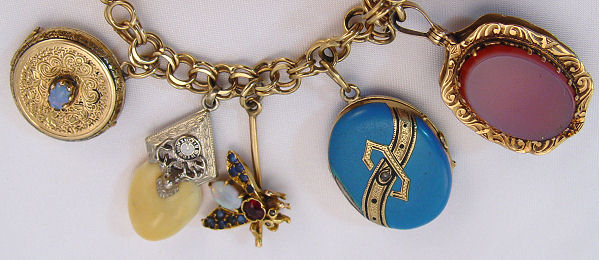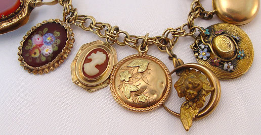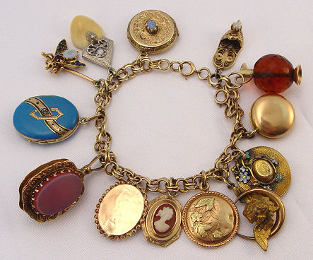 14K CHARM BRACELET WITH 13 CHARMS: Double link bracelet, 7''l., marked 14k. Charms to include, 14k filigree slipper with pearl, glass bead gold tone metal mount claret jug, puffed disk of gold centered by garnet flower, lady's sun hat with enameled flower decoration, winged cherub head in crescent with locket hook to back, two tone gold disk with foliate design marked 14k, cameo locket, paint decorated carnelian disk, double picture locket, blue enamel locket in worn condition, multi gem bug on a branch - opal sapphire garnet, Elks Club charm with polished antler marked 14k, and a faux locket with worn enameling and black? opal. All together 58 grams.