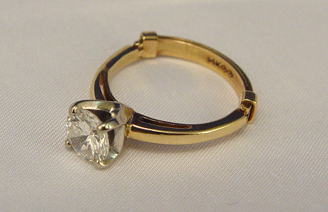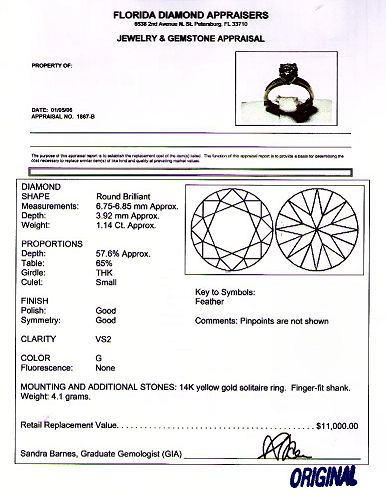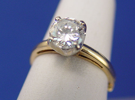 1.14CT DIAMOND SOLITAIRE: Round brilliant cut diamond, 6.75mm x 6.85mm x 3.92mm, VS2 clarity and G color, prong set in 14k white gold on yellow gold ring with ''Finger-fit'' shank, size 7 closed, size 9 open, 4.1 grams. Sold with current Florida Diamond Appraisers appraisal, retail replacement value $11000.00.