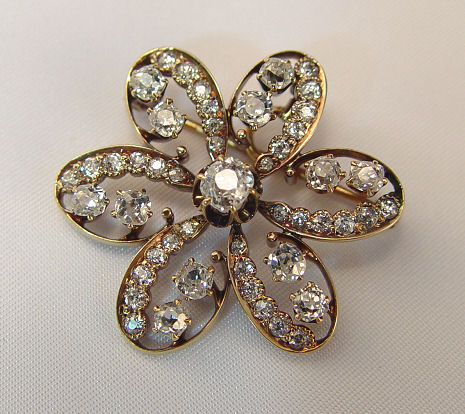 VICTORIAN DIAMOND BROOCH PENDANT: Transitional period piece of 14k yellow gold set with 2.90ctw of old mine cut diamonds. Center stone approx. .35ct, 4.66 x 4.14 x 2.64mm, I-J color SI2 clarity, 42 smaller stones line the edges of the petals. Bar pin closure and pivot bail, 7.4 grams. Sold with current Florida Diamond Appraisers appraisal, retail replacement value $5850.00. Est. $2500/3500**
