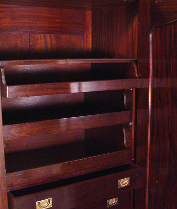HANDSOME CROTCH GRAIN MAHOGANY ARMOIRE CABINET: Late 19th early 20th C. Highest quality cabinetry. The divided interior has garment hooks and rod on one side, shirt drawers and 4 drawers with brass pulls on the other. Carved stiles and feet, overhanging molded cornice. 6 1/2 ft. h. x 67''w. x 24'' deep overall.