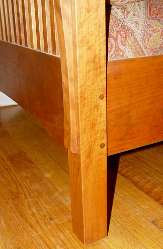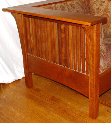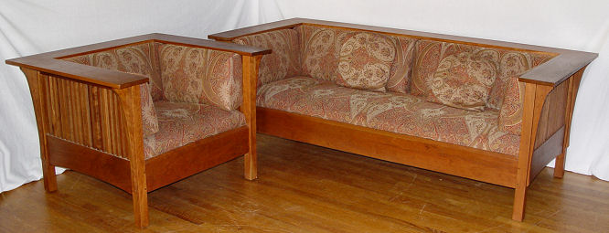 STICKLEY CHERRY ''PRAIRIE SPINDLE'' SETTLE AND ARM CHAIR: Sofa model #91-0234, 29 1/2''h. 85''l, 37 1/2'' deep. The matching chair is model #90-0417, 29 1/2''h. x 42 1/2'' x 37 1/2''. Removable back cushions, spring seats, throw pillow included. Stickley brand mark and metal name plate. Original retail price was $5,650. in 1999.