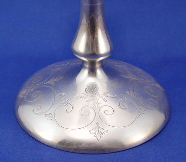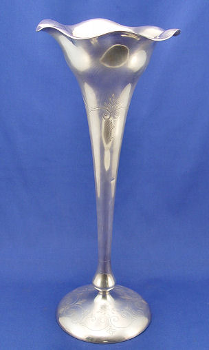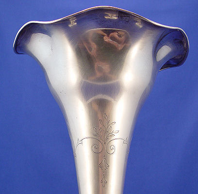 VERY TALL SHREVE & CO STERLING TRUMPET VASE: Inscribed decoration on a tall ruffle rim vase, monogrammed, 17 3/4''h. Approx. 872 grams, 28.03 oz. ''Base loaded''. Est. $1200/1400**