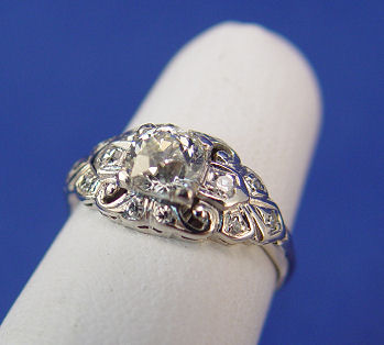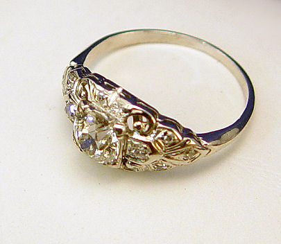 PLATINUM FILIGREE DIAMOND RING: Approx. 1ctw centered by a 73pt diamond, 5.6 x 5.6 x 3.8mm, purported G color VS clarity, in a raised basket above the deco motif diamond encrusted top, circa 1920's, size 5.5, 2.7 grams. Est. $1800/2000**