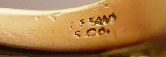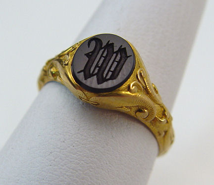 TIFFANY & CO LADY'S SIGNET RING: 18k yellow gold (assayed) with embossed scrolling design centered by a carnelian disk carved with W, marked Tiffany & Co, size 7.75, 6.6 grams.