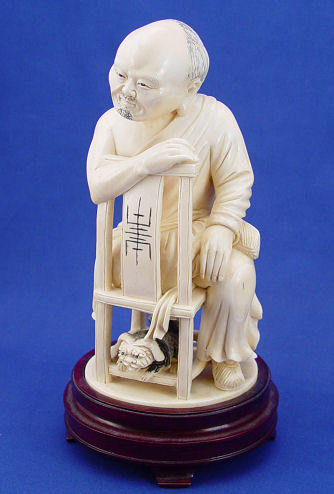 CHINESE CARVED IVORY FIGURE: A substantial figure of a pensive man with dog under his chair. Signed on silver plaque. Ivory is 9''h, stand an additional 2''h.