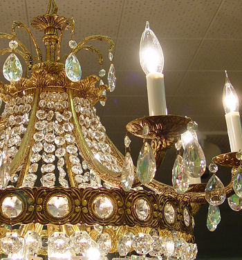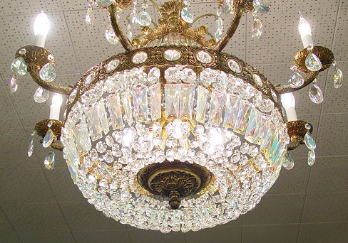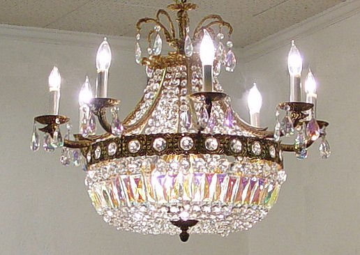BRASS & CRYSTAL 8 LIGHT CHANDELIER: Made in Spain, 28'' dia. 24'' h. with iridescent and clear crystal prisms and prism chains.