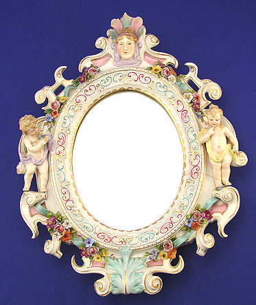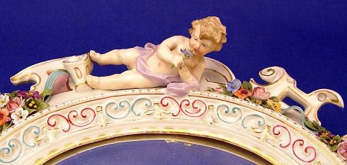 MEISSEN QUALITY CHERUB DECORATED TABLE TOP MIRROR: Cherubs flank the looking glass, figurehead at the crest. Dark green cross swords mark, 14'' x 11''. Please note crack on frame.