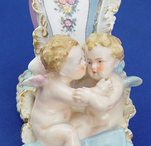MEISSEN GERMAN PORCELAIN CHERUBS ON SHOE: Sweet depiction of winged cherubs in an affectionate moment. 5 1/2''h. 6''l. Blue cross swords under glaze.