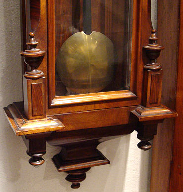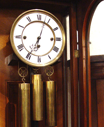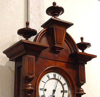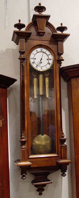 PERIOD VICTORIAN REGULATOR CLOCK: Warm arched top walnut case, 7'' enamel dial framed in brass, 3 weight driven, in working order. 54''h. 15 1/2''w.
