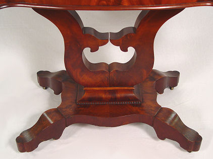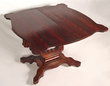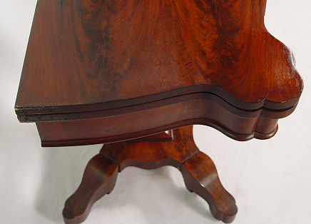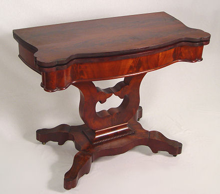 19th C AMERICAN EMPIRE ROSEWOOD GAME TABLE: Shaped top flips and opens to 36'' x 37''. Curved and divided pedestal base with scrolled and shaped feet, original casters. 30''h. 16 1/2'' x 18 1/2''.