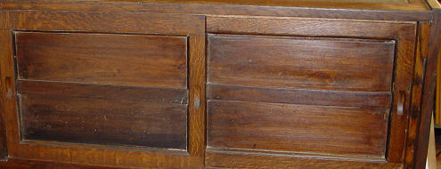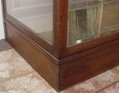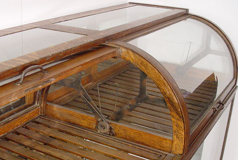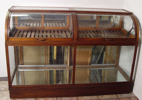 OAK HUMIDOR CIGAR DISPLAY CASE: Domed top with original curved sliding lift top front. Lower section with glass doors. 48''h. x 71'' x 26 1/4'' deep.