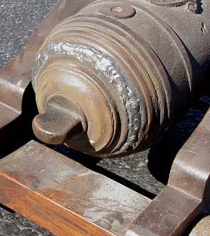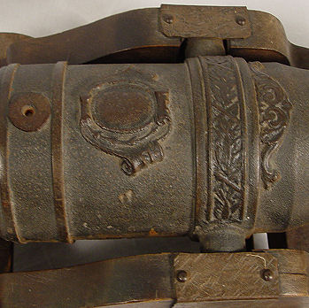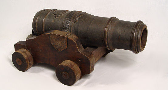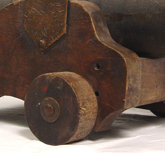 SPANISH CULBRINA CANNON, CA 1800's: On wooden wheels, please note repair to back end where it was blown off during use, 9''h, 23''l.