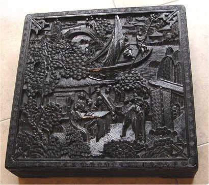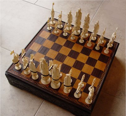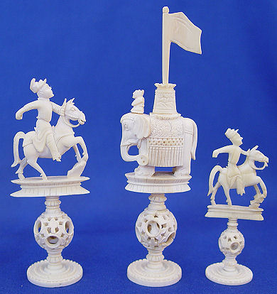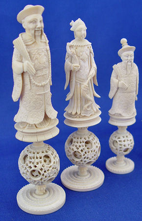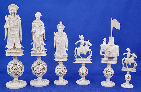 CHINESE CARVED IVORY CHESS SET AND HIGHLY CARVED STORAGE BOX: Elaborately carved figures, each on a mystery ball base. The kings are 6 3/4'', the pawns are 3 1/2''. One of the best we've seen.