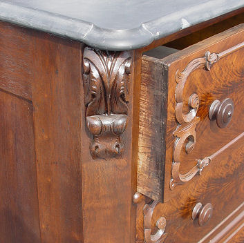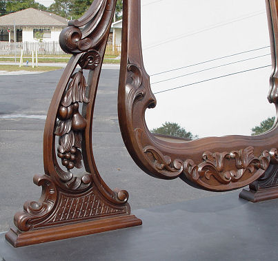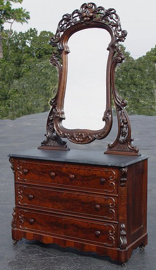 LOVELY FLAME GRAIN MAHOGANY DRESSER WITH SHAPED MIRROR: Two half drawer over two full drawer dresser with vibrant veneer and applied scrolling decorations, acanthus leaf decorations to the sides and topped by dark marble. Shaped mirror with wonderful carved harp and top, fruit motif. 49''w. x 21 3/4''d x 93''h.