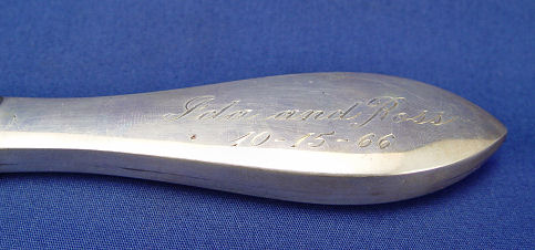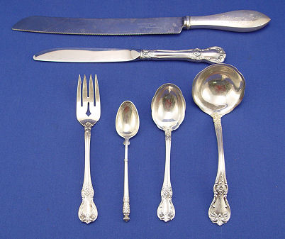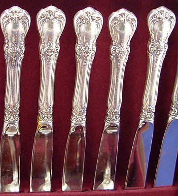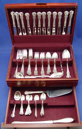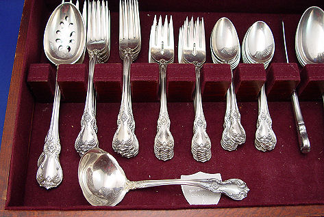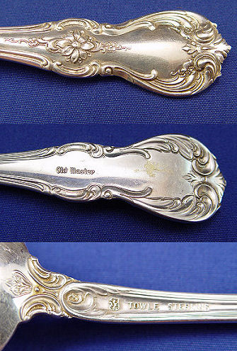 TOWLE STERLING FLATWARE SERVICE FOR 12, ''OLD MASTER'': 56 pcs to include, dinner knives 8 7/8'' with stainless blades, dinner forks 7'', salad forks 6 3/8'', teaspoons 6''. Serving pieces to include, 3 spoons 8 1/2'', ladle 6 5/8'', slotted spoon 8 1/2'', cold meat fork 8 1/4'', cake knife 10 1/4'', sugar shell 5 3/4''. Also, in the bottom drawer of storage case you will receive 8 Frank Smith ''Federal Cotillion'' demitasse spoons 4 3/8'', 6 unmarked demitasse spoons etched in a lovely pattern 5'', and a sterling handled carving knife marked WFB Sterling Handle Blade made in Sheffield England Stainless Steel 12 1/2''l dedicated Lola and Ross 10-15-66. Sold as a lot.