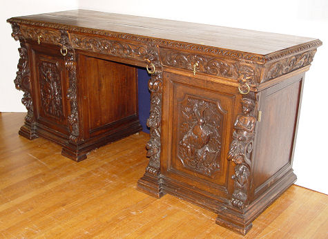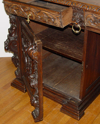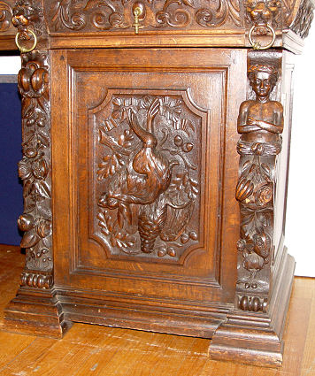19TH C. CARVED OAK PEDESTAL SIDEBOARD: Featuring carved game on the doors to the pedestal cabinets and lions head masquerons as drawer pulls. Original finish, 37''h. x 83''w. x 28'' deep overall. Please call for condition.
