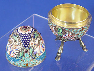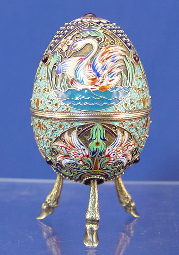 RUSSIAN SILVER AND ENAMEL EASTER EGG: Nikotay Zverev, Moscow 1898-1912. Egg shaped covered box on hairy legs and hoof feet. Decorated in a swan motif and set with cabochon stones. Silver content 84, gilt interior. 5 1/2'' h.