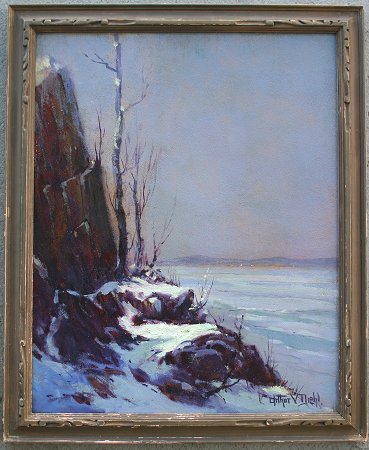 DIEHL, Arthur, (American, 1870-1929): Winter Lakeside Scene, O/B, 20'' x 16'', signed LR, original carved gilt frame with some wear, 22 3/4'' x 18 3/4''.