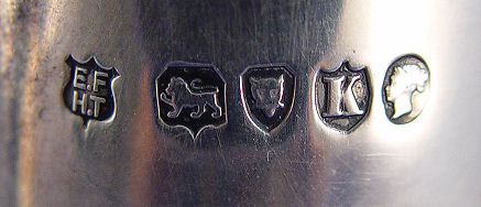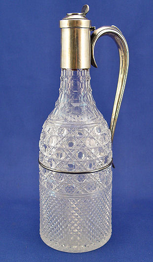 STERLING MOUNTED CUT GLASS WINE DECANTER: London 1885-85, maker EF HT. Hinged top, 11 1/2''h.