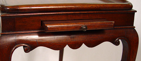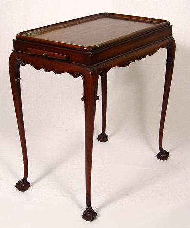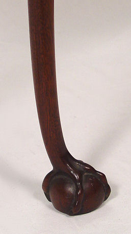 MAHOGANY TEA TABLE: Note the hand chiseled thick mahogany apron and candle slides. Raised on delicate cabriole legs ending in ball and claw feet. 26''h. x 23 1/2'' x 14''.