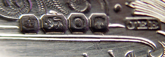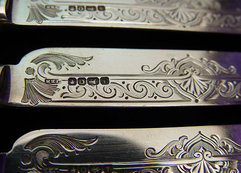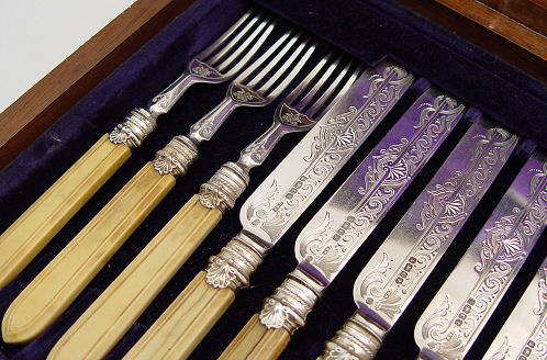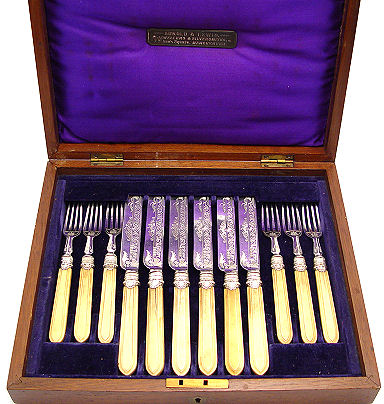 ENGLISH VICTORIAN SHEFFIELD STERLING AND IVORY FRUIT SET: Service for 6, ivory handles with sterling blades and tines, lovely etching to silver areas, Crown & Lion touch marks denote Sheffield, O = 1881, head = 1838-1890, maker mark JEB, knives 8'', forks 6 1/2''. In wooden presentation box from Arnold & Lewis Jewellers & Silversmiths 7 St. Ann's Square, Manchester. Est. $600/800**