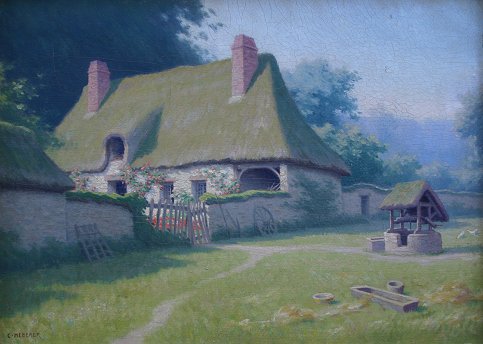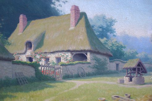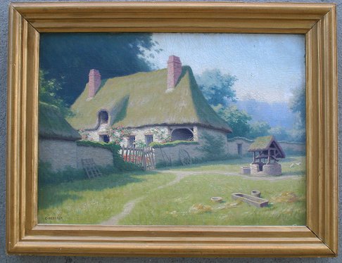 HEBERER, Charles, (American, 1868-1951): Cottage Landscape in France, O/C, 13'' x 18'', signed LL, overpainted gilt frame, 17'' x 22'', titled verso. Former property of the artist's granddaughter.