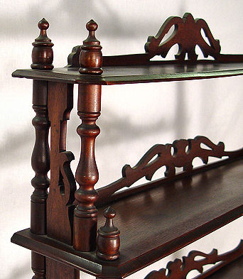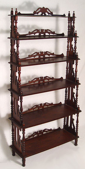19TH C VICTORIAN ETAGERE CURIO DISPLAY SHELF: Open display on 5 graduating shelves, carved supports, original finish. 63''h. x 32''w. The upper shelf is 5'' deep, the lowest is 12'' deep.