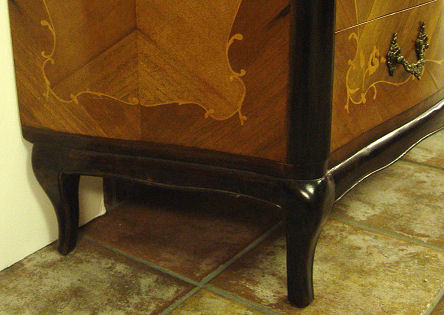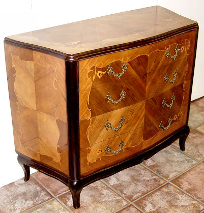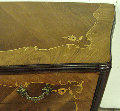 FRENCH LOUIS XV STYLE MARQUETRY INLAY COMMODE: 4 drawer chest, slight bow front,, 35 1/2'' x 44'' x 18''.