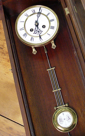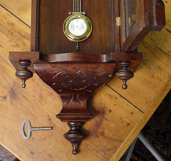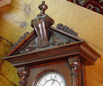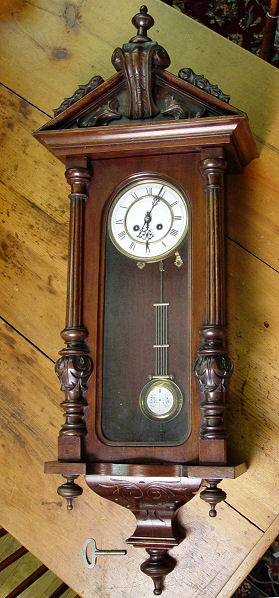 VICTORIAN WALNUT CASE WALL CLOCK: Key wind, gong strike movement with pendulum and key included. No makers identifying marks. 40''h. x 14 1/2'' x 7 1/2''.