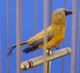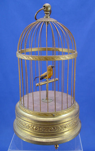 SINGING BIRD AUTOMATON: Smaller than the previous lot, but sounds just as sweet. Fully automated head and tail, brass cage is 12''h, 6 1/2'' dia.