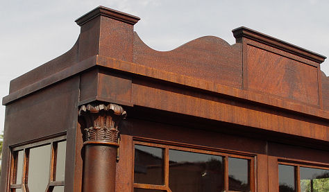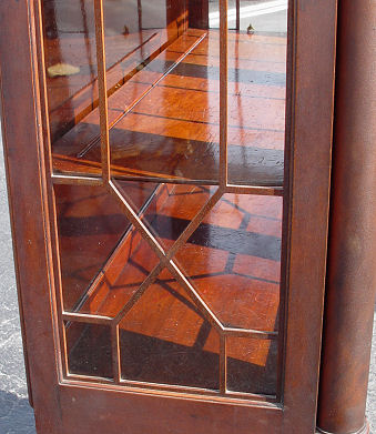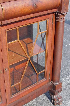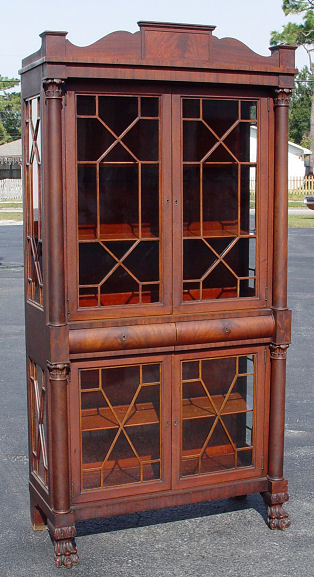 EMPIRE CHINA CABINET / BOOKCASE: Double glass doors with fret work to each section, top with 2 shelves, bottom with one, columns to side with foliate tops, paw feet to front, 80'' x 40'' x 16''.