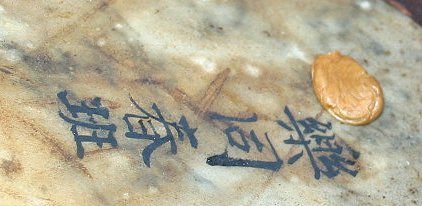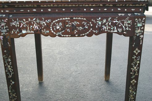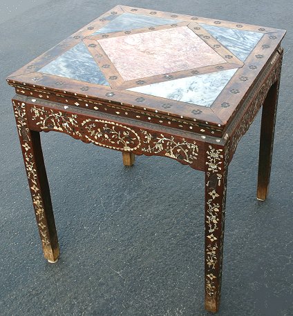 ORIENTAL MARBLE AND MOTHER OF PEARL INLAY TABLE: Square top table with gray marble inserts to the top. Mother of pearl inlay apron and legs. Please call for condition. 31''h. x 27 1/2'' x 27 3/4''.