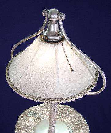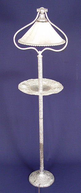 SILVERPLATE REPOUSSE FLOOR LAMP: Panels of Dutch genre scenes separated by scrolling flowering vine and individual man and woman with child sections to circular tray table. Matching design to silverplate sheets wrapped around pole in sections, some tarnish where sections meet. No mark found, wear to faces on tray plus small section of silverplate missing. Overall approx. 55''h., approx. 12'' tray table is 32 3/4'' from floor, currently with cloth shade, frame opening 14'' at widest, fitter rim of shade 2''.