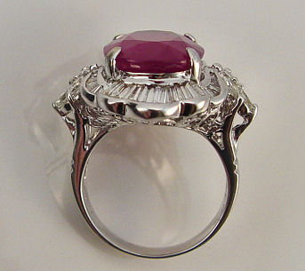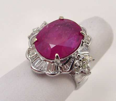 11CT RUBY & 2.5CTW DIAMOND DINNER RING: Great color and flash for your right hand. Oval cut ruby of approx. 11.17ct prong set and surrounded by baguette and marquise cut diamonds, G to L in color and VS1 to SI2 in clarity. 18k white gold, size 7, approx. 11.9 grams. Sold with current Gemological Appraisers of America, Inc. appraisal, Retail Replacement value for insurance purposes $14,044.00. Est. $5000/7500**