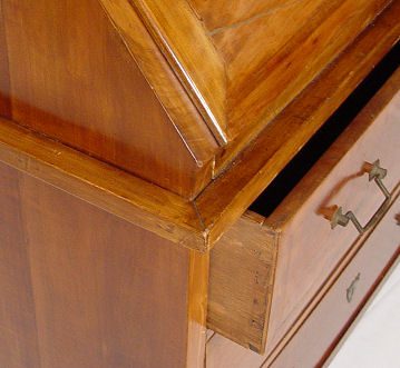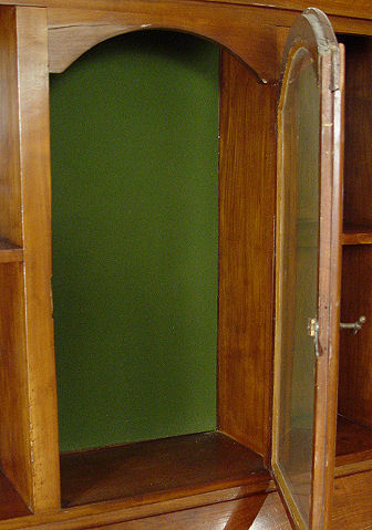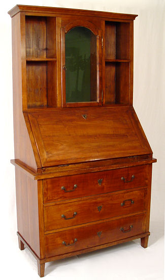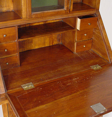 WALNUT SECRETARY DESK, CA 1840: Three full drawer base supports the dropfront desk and glass door flanked by open bookshelves above. Approx. 70 1/2''h., 37 1/4''w. x 20 3/4d.