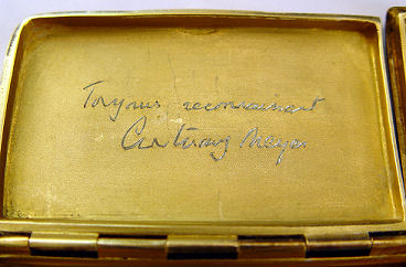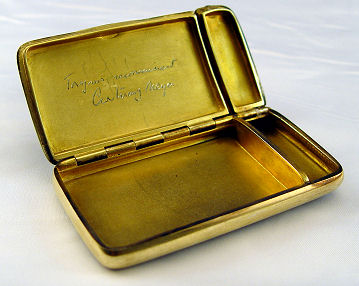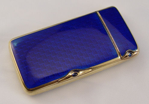 EARLY DAVID-ANDERSEN NORWAY CIGARETTE MATCH CASE WITH STRIKER: Lovely blue basket weave enameling on silver with gold wash to visible metal, sapphire cabochons to small handle of each section, touch marks inside rim of cigarette section lid denoting pre 1925 manufacture, approx. 3 3/4'' x 1 7/8'' overall.