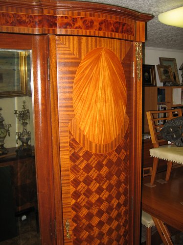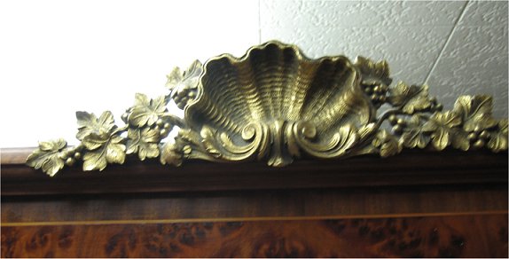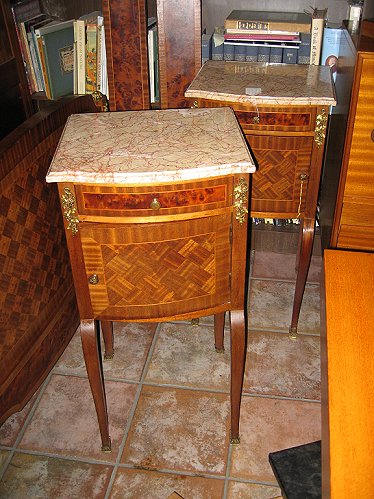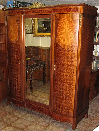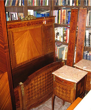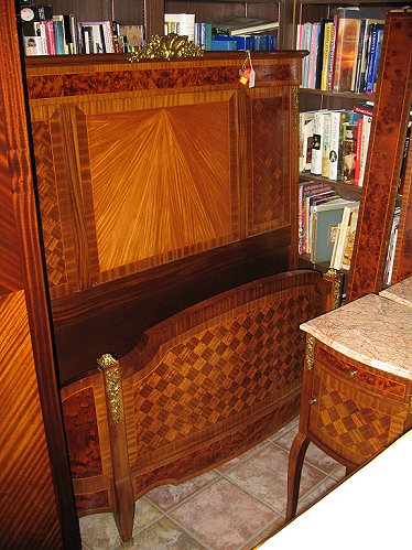 FRENCH ORMOLU PARQUETRY INLAID BEDROOM SET: Full size bed with ormolu, armoire, and pair of marbletop nightstands. First quarter 20th C.