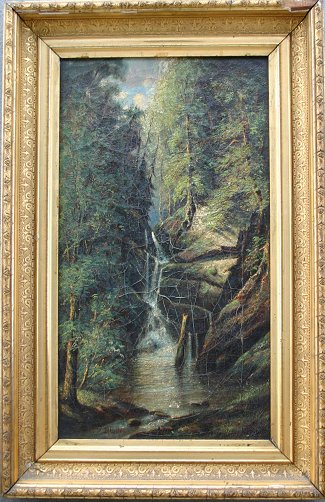 19TH C WATERFALL O/C: Signed LL illegibly, 22'' x 12'', period frame with wear and missing gesso, 27 1/2'' x 17''.