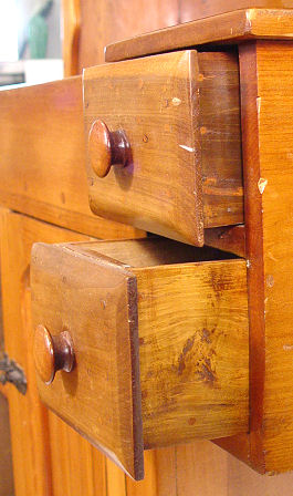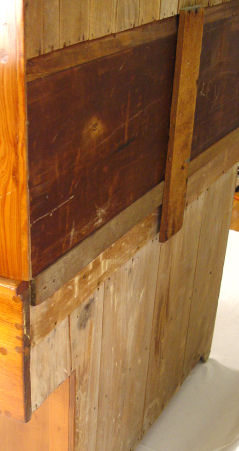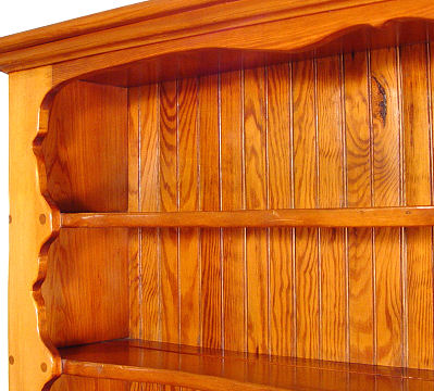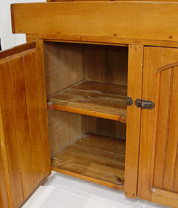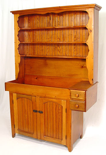 PINE DRY SINK HUTCH: Top with four shaped shelves having plate grooves over sink well with small counter space over two small drawers, double door base with shelved interior, 54''h. x 33''w. x 17 1/4''d.