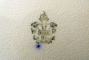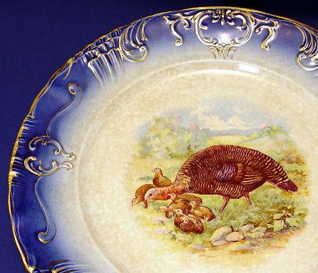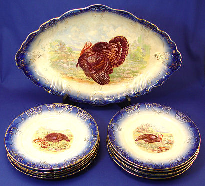 WHEELING POTTERY LA BELLE FLOW BLUE TURKEY PLATTER AND 12 PLATES: Ca. 1893-1910. Each piece centers a transfer design featuring a tom turkey or hen with chicks. The platter is 19 3/8'', the plates are 10 1/4'' dia. Some crazing with discoloration, no chips or cracks. Est. $600/800**