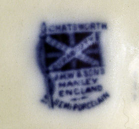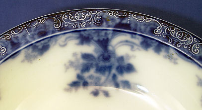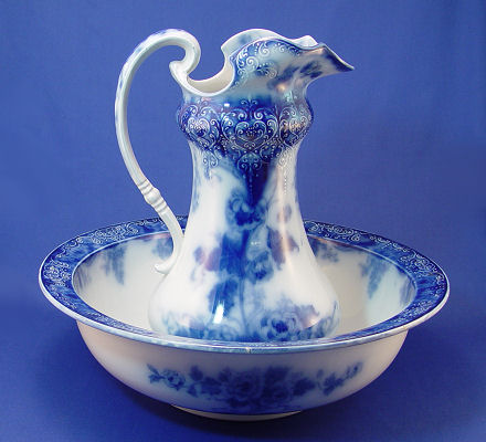 ENGLISH FLOW BLUE PITCHER & BOWL CA. 1900: Chatsworth floral design on Art Nouveau shaped pitcher, the pitcher is marked ''J.H.W. & Sons Hanley England Semi Porcelain'' (J.H. Weatherby & Sons), pitcher 13 3/8''h., bowl 16 5/8'' d. Est. $450/600**