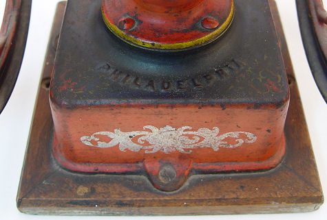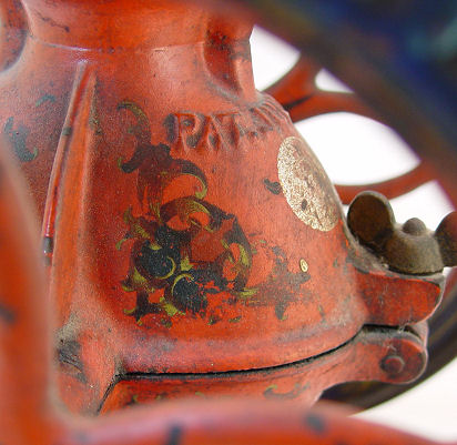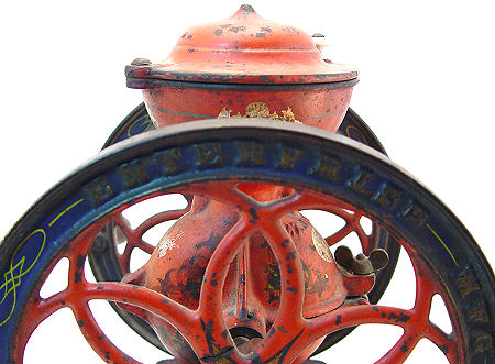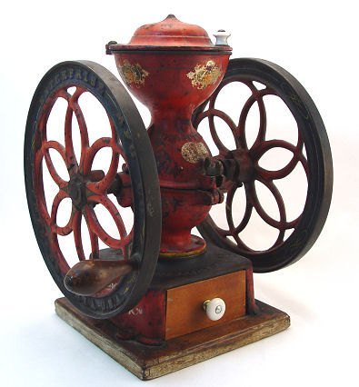 ENTERPRISE CAST IRON COFFEE MILL VINTAGE CA 1880: Original red paint, the wheels are 10 1/4'' dia. Wooden drawer with porcelain knob. 14''h. overall.