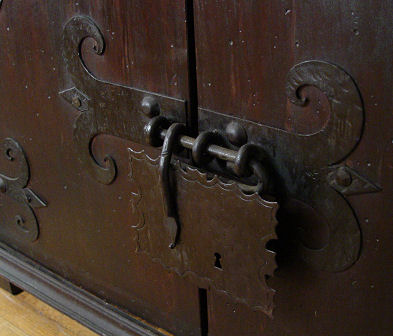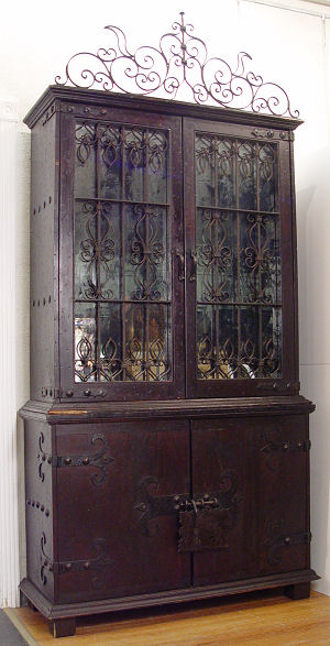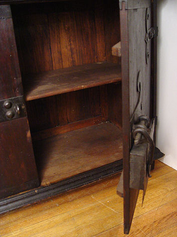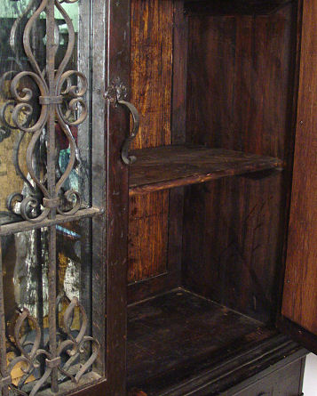 SPANISH CUPBOARD CABINET HEAVY WITH WROUGHT IRON: Upper cabinet has scrolled iron across the top and fret work over the glass front doors. Lower cabinet door, with iron hinges and mounts. Approx. 97''h. x 46 1/2''w. x 18''d.