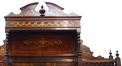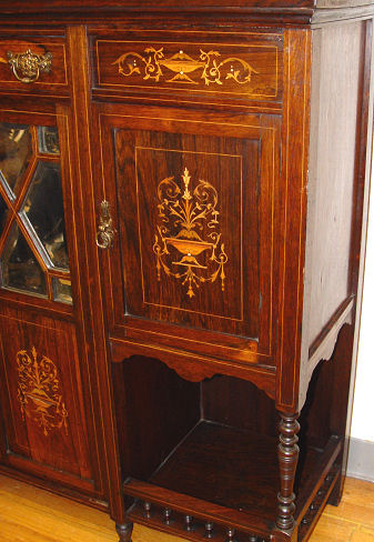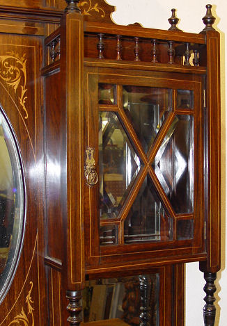 MAGNIFICENT EDWARDIAN INLAY DISPLAY BUFFET CABINET: Round beveled mirror under a outwardly curved crest. Spindle gallery over side cabinets with beveled and individual paned glass. . Lower section with cabinet door. 7'10''h. x 4'5 1/2'' x c 1'4'' deep.